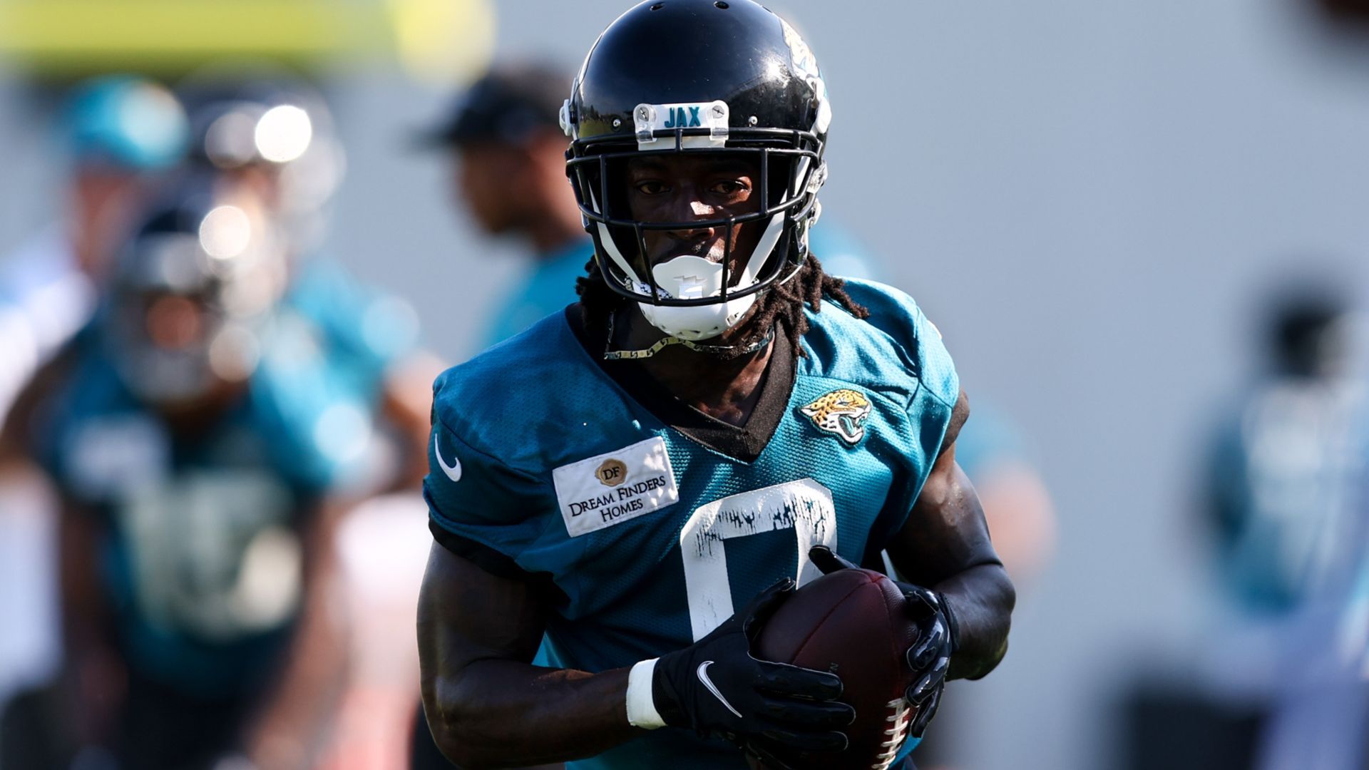Jul 26, 2023; Jacksonville, FL, USA; Jacksonville Jaguars wide receiver Calvin Ridley (0) participates in training camp at Miller Electric Performance Center. Mandatory Credit: Nathan Ray Seebeck-USA TODAY Sports