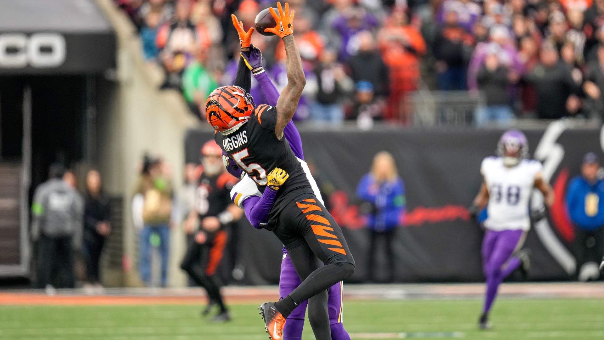 Minnesota Vikings cornerback Akayleb Evans (21) breaks up a deep pass intended for Cincinnati Bengals wide receiver Tee Higgins (5) in overtime of the NFL Week 15 game between the Cincinnati Bengals and the Minnesota Vikings at PayCor Stadium in downtown Cincinnati on Saturday, Dec. 16, 2023. The Bengals won on an overtime field goal. Photo Credit: Sam Greene/The Enquirer / USA TODAY NETWORK