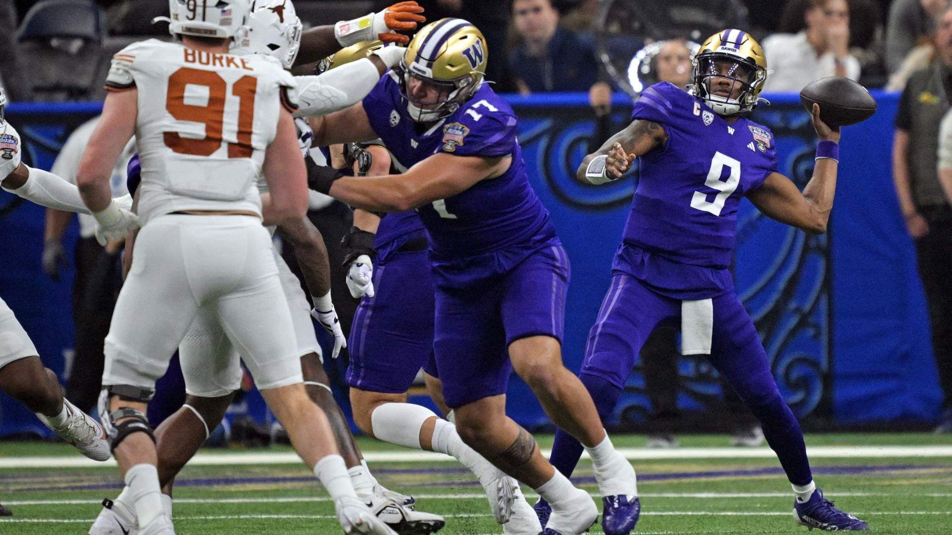 Jan 1, 2024; New Orleans, LA, USA; Washington Huskies quarterback Michael Penix Jr. (9) throws a pass during the first quarter against the Texas Longhorns in the 2024 Sugar Bowl college football playoff semifinal game at Caesars Superdome. Mandatory Credit: Matthew Hinton-USA TODAY Sports