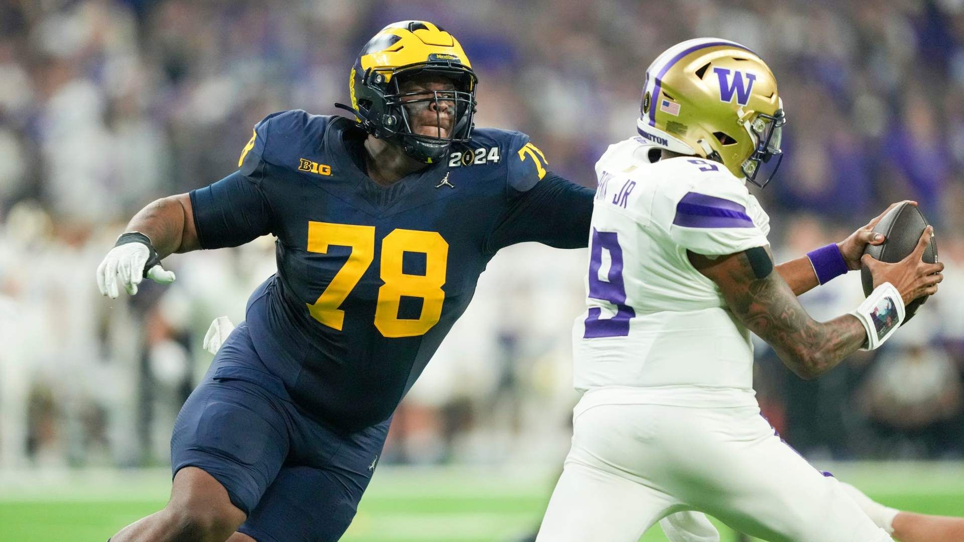 Michigan defensive lineman Kenneth Grant (78) reaches out to sack Washington quarterback Michael Penix Jr. (9) in the second quarter during the College Football Playoff national championship game against Washington at NRG Stadium in Houston, Texas on Monday, January 8, 2024. Photo Credit: Melanie Maxwell / USA TODAY NETWORK