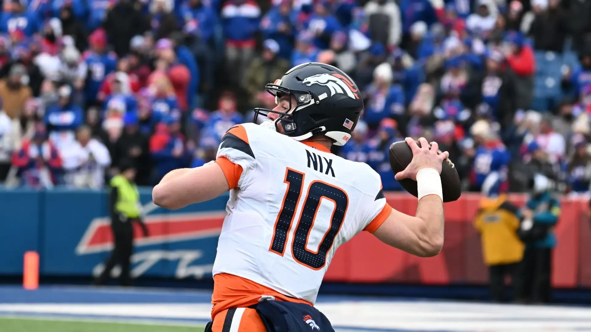 Jan 12, 2025; Orchard Park, New York, USA; Denver Broncos quarterback Bo Nix (10) throws downfield during the first quarter against the Buffalo Bills in an AFC wild card game at Highmark Stadium. Mandatory Credit: Mark Konezny-Imagn Images