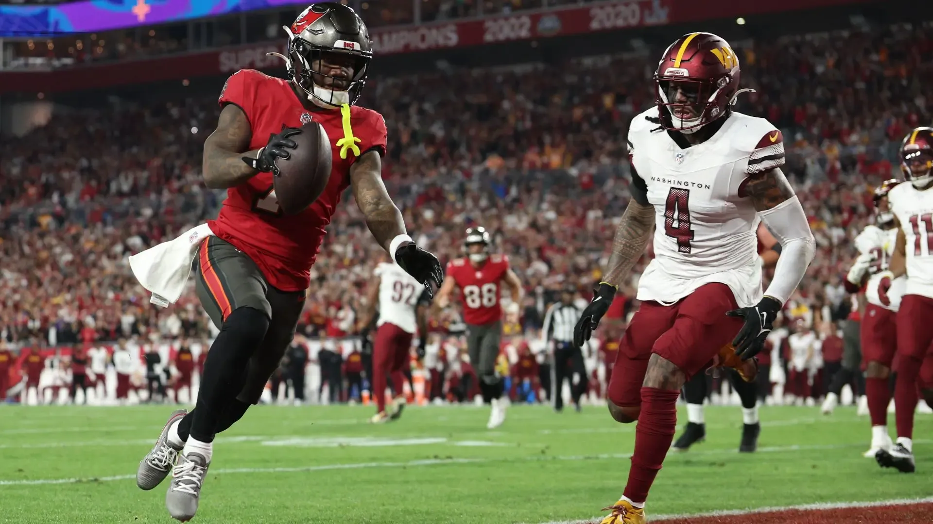 Jan 12, 2025; Tampa, Florida, USA; Tampa Bay Buccaneers running back Bucky Irving (7) makes a touchdown catch against Washington Commanders linebacker Frankie Luvu (4) during the third quarter of an NFC wild card playoff at Raymond James Stadium. Mandatory Credit: Nathan Ray Seebeck-Imagn Images