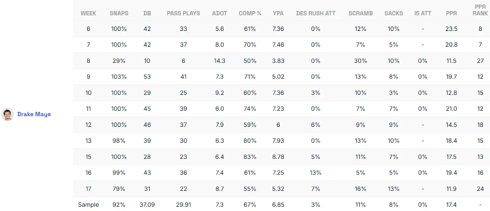 Maye didn't get the full-time job until Week 6, but from that point through Week 17, he averaged 17.4 points per game.
