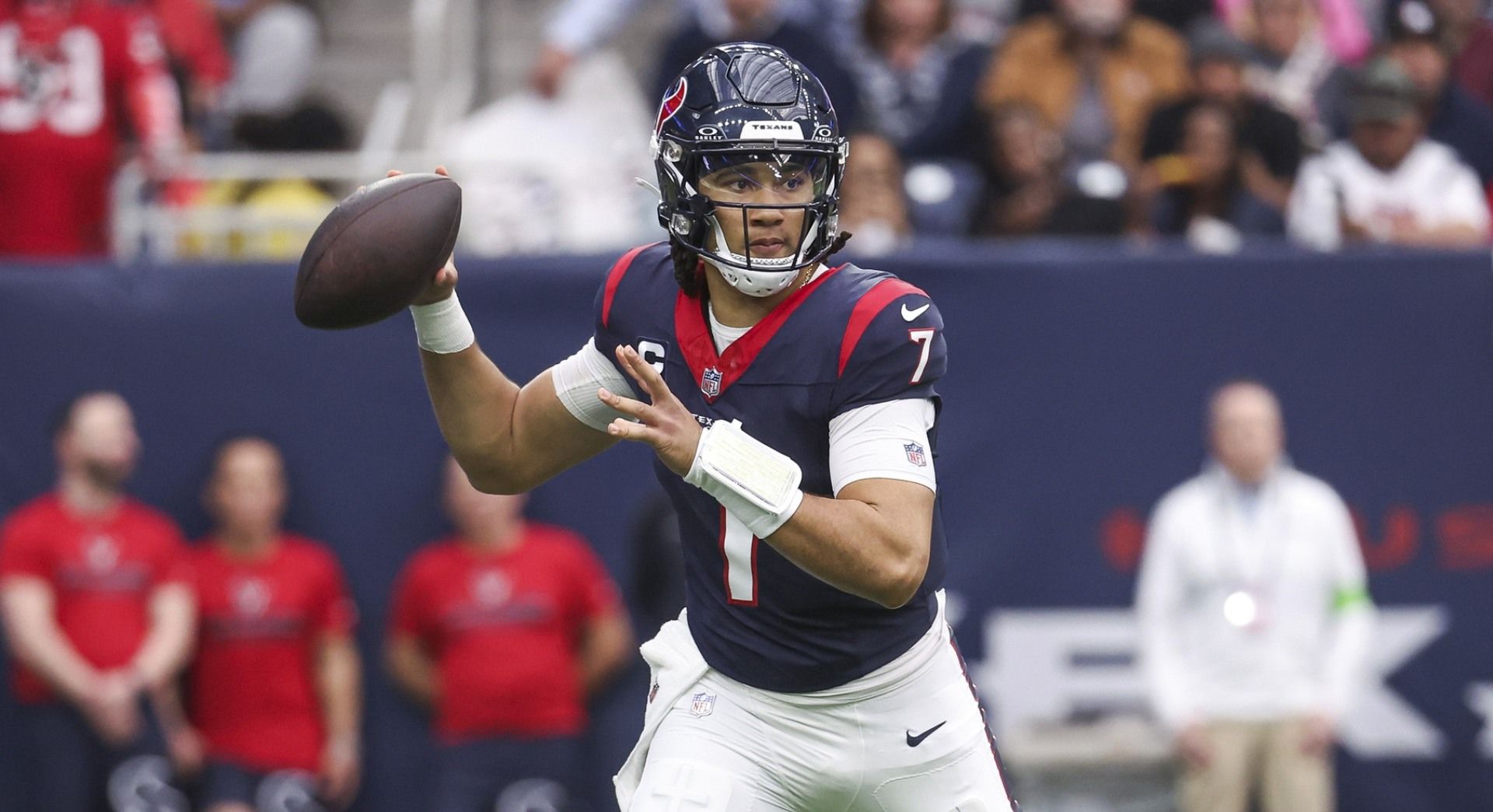 Dec 31, 2023; Houston, Texas, USA; Houston Texans quarterback C.J. Stroud (7) attempts a pass during the third quarter against the Tennessee Titans at NRG Stadium. Mandatory Credit: Troy Taormina-USA TODAY Sports