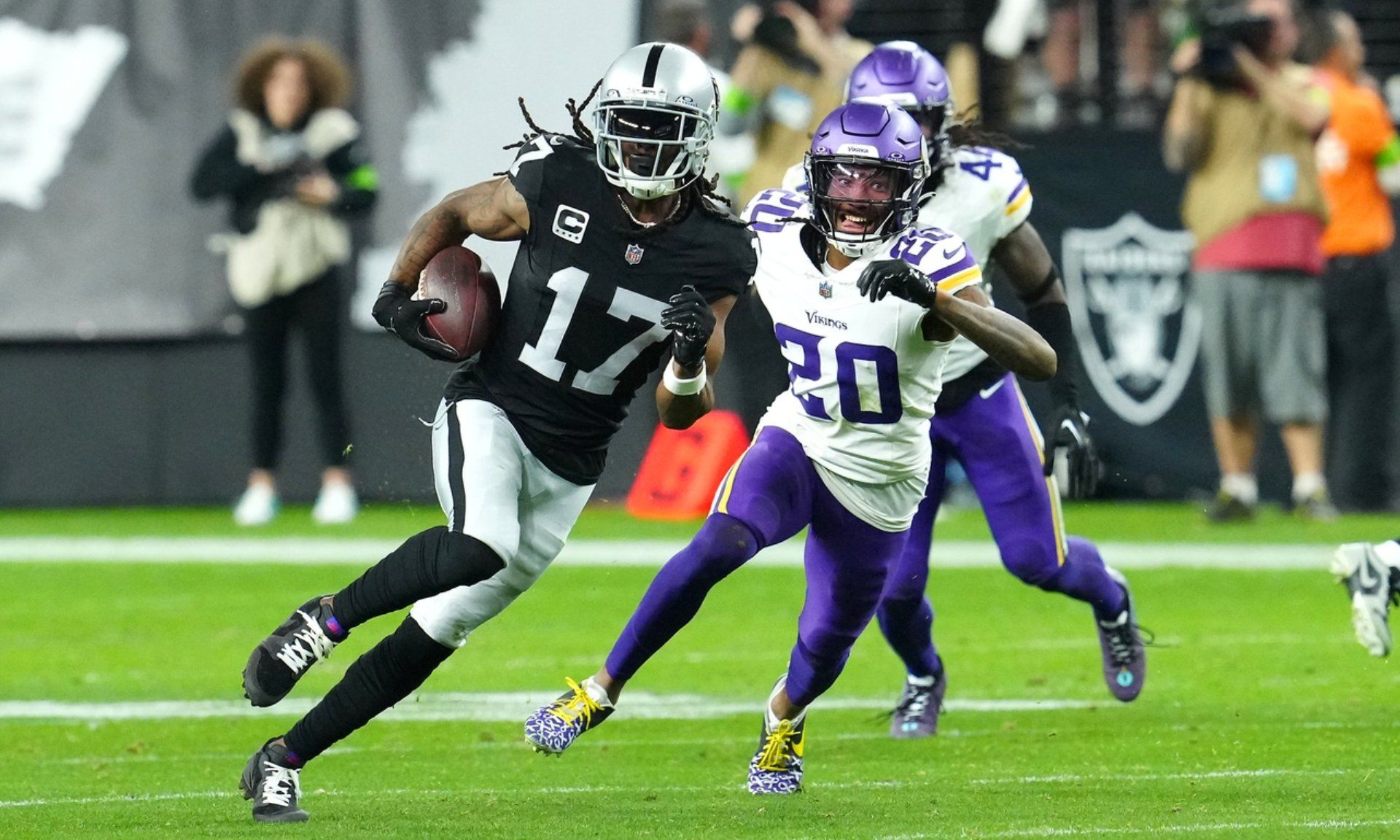 Dec 10, 2023; Paradise, Nevada, USA; Las Vegas Raiders wide receiver Davante Adams (17) gains yards ahead of Minnesota Vikings safety Jay Ward (20) during the final seconds of the fourth quarter at Allegiant Stadium. Mandatory Credit: Stephen R. Sylvanie-USA TODAY Sports
