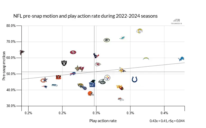 Overall, Johnson's play-action rate in three seasons with the Lions was the highest in the league by 5.2! Top-eight marks in pre-snap motion (59.3%) and trick looks (7%) reflect the reality that there is a LOT for defenses to worry about on any given play.
