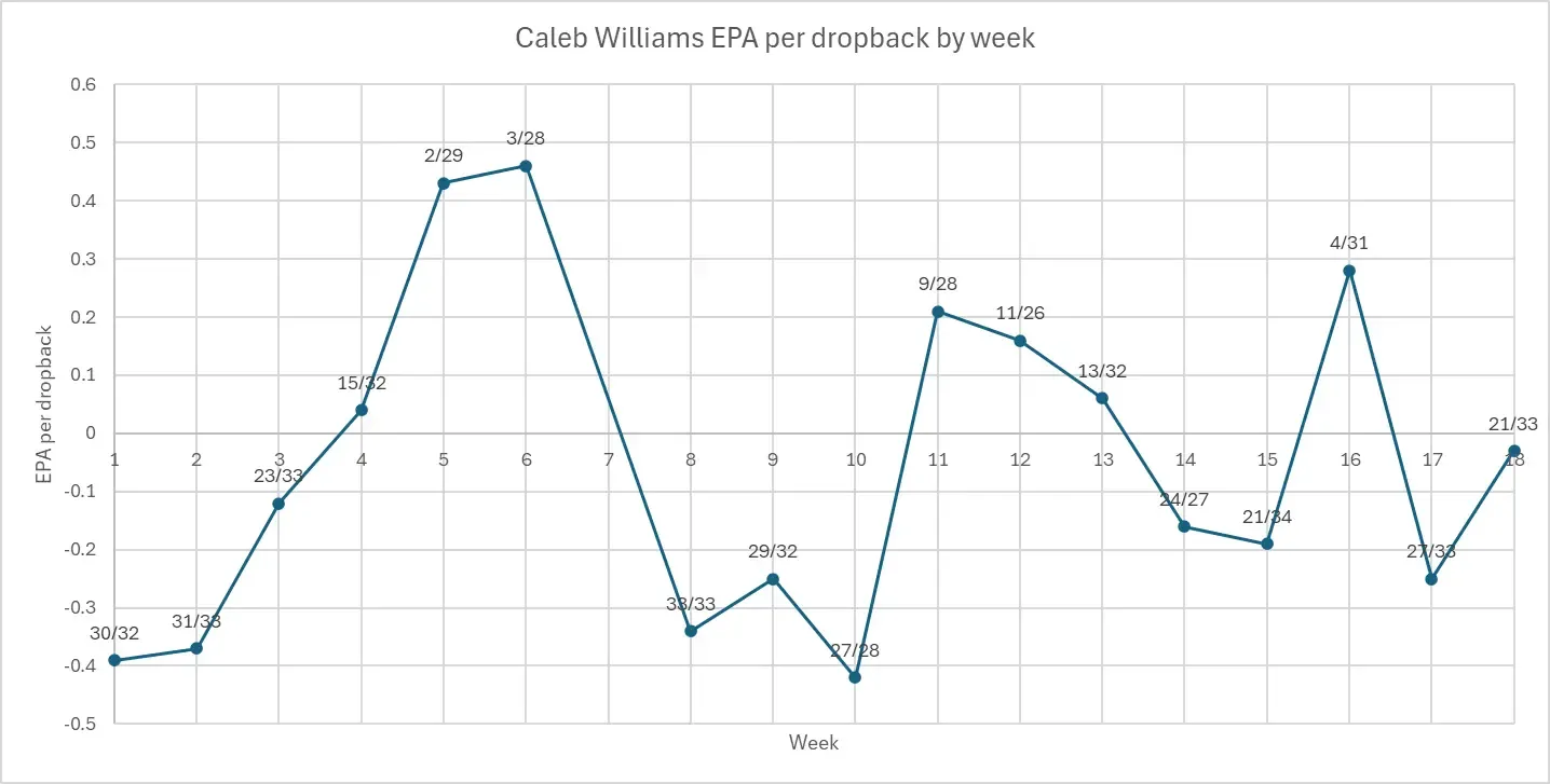 Still, there were too many times when the easy was hard, and negative plays were far too frequent, particularly when it came to avoiding sacks: Only Will Levis (30.4%) had a higher pressure-to-sack rate than Williams (28.2%) in 2024. PFF assigns blame on each sack, and Williams led the league in his OWN sacks taken (17) independent of the offensive line's own much-publicized issues.