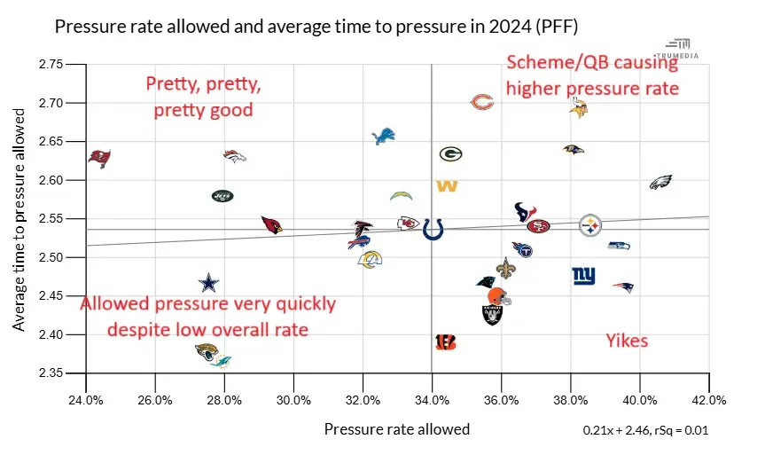 But yeah: The Cowboys are basically hoping that improved health and continuity will turn this rather bad group into something better. Overall, Dallas was just 31st in yards before contact per carry last season, and their low pressure rate allowed mark comes with the caveat that the pressure was arriving awfully quickly.
