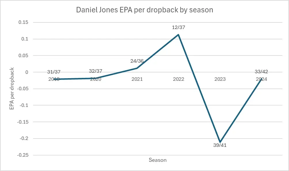 - EPA per dropback: Jones (-0.087, 39th), Richardson (-0.024, 30th)