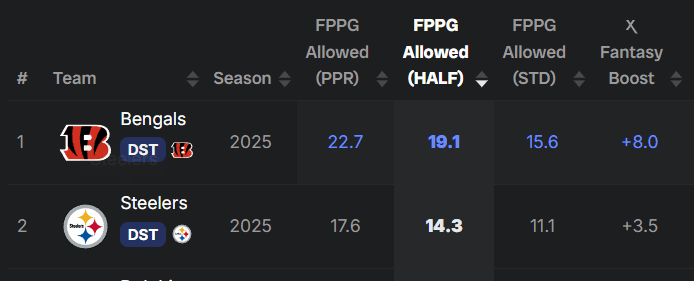 They give up the biggest fantasy boost to opposing TDs by a wide margin—more than 5 points per game than the next worst team (the one he just lit up like a Christmas tree):