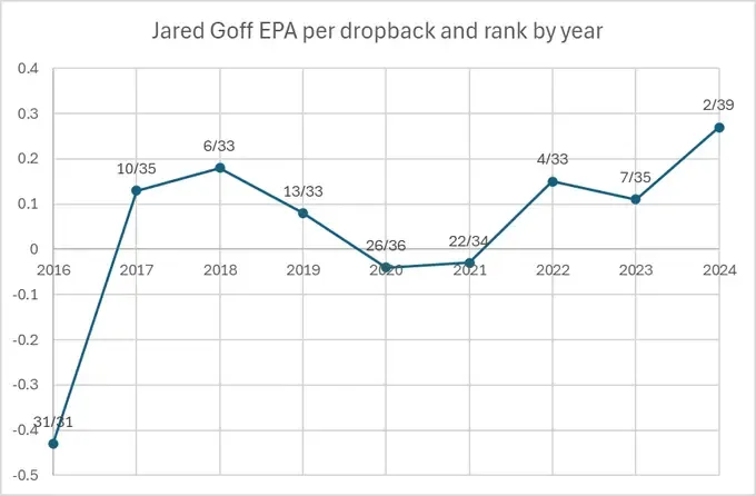 Here's the only problem with assuming a high-end encore in 2025: This Lions offense, like Goff, has been awesome the last three years, but pocket passers who run as little as the 30-year-old franchise QB need to be almost perfect through the air in order to contend with the dual-threat aliens in the position's top five.