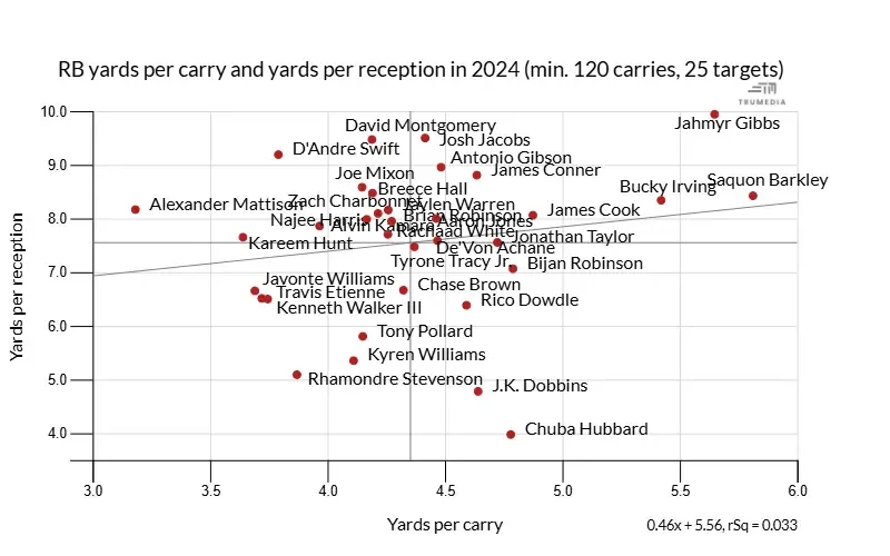 Even the pass-game usage is a bit underrated: Did you know Montgomery (36-341-0 receiving) scored more PPR points per game as a receiver (5) than Saquon Barkley (4.55), Josh Jacobs (4.48), and James Cook (4.36) last season? Bucky Irving barely edged him out at 5.07! Madness!