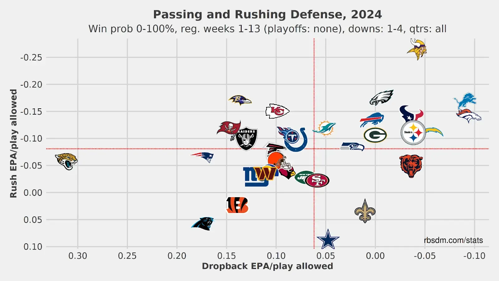 The following chart denotes every defense's EPA allowed per run and pass. Groups in the upper right quadrant have been quite good at defending both, the bottom left have sucked at both, the far left have been worse against the pass, and the bottom groups have especially struggled at stopping the run.