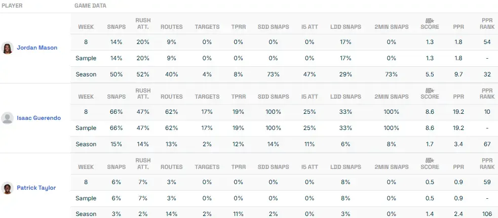 Of course, the 49ers haven't exactly treated their next-man-up at RB exactly like CMC over the years. This was the case for Guerendo back in his only extended appearance of the season in Week 8 against the Cowboys.