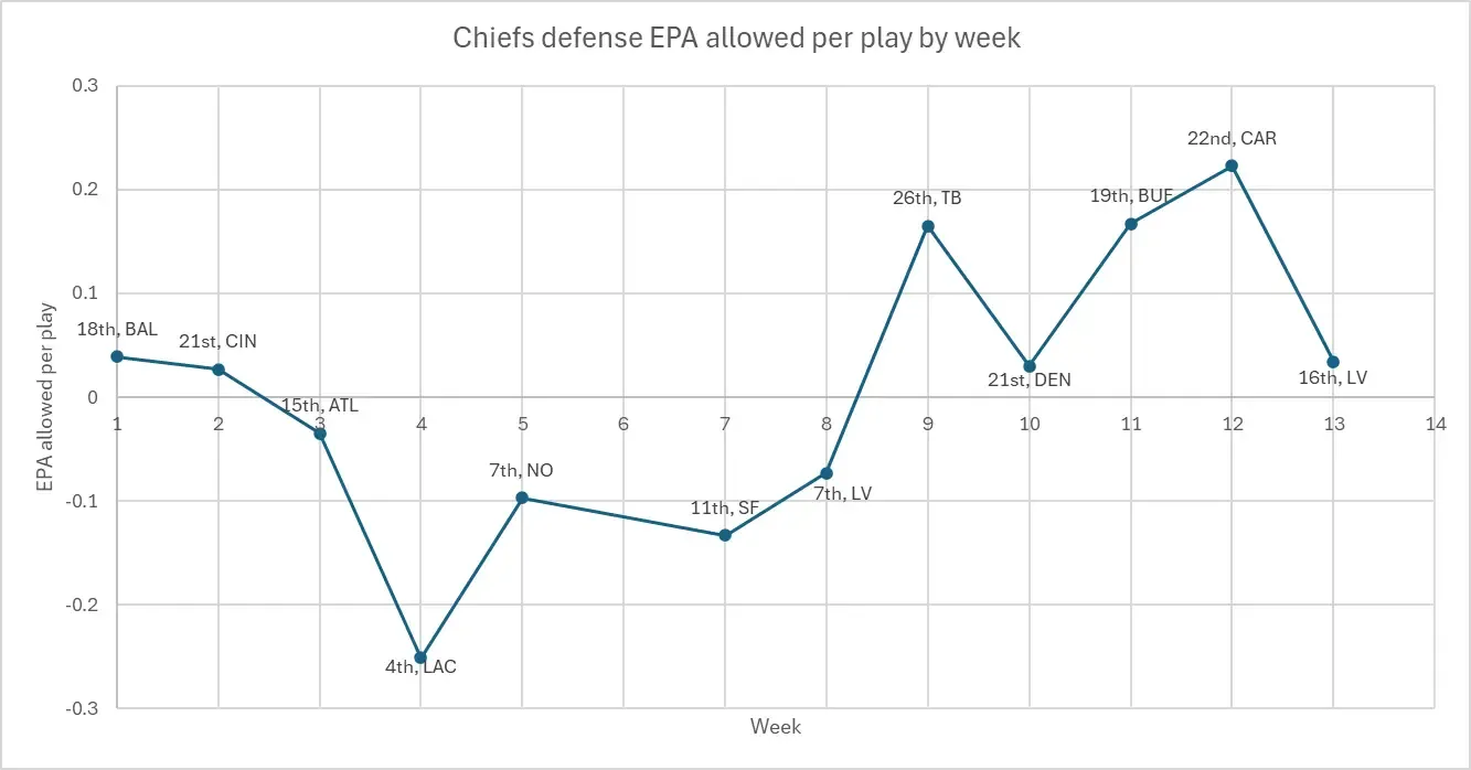 The defense has remained competent enough against the run (16th in EPA allowed per rush) since Week 9, but the pass defense has fallen off a cliff. Overall, only the Jaguars, Giants, and Raiders have allowed more EPA per dropback than the Chiefs (+0.237) over the last five weeks.