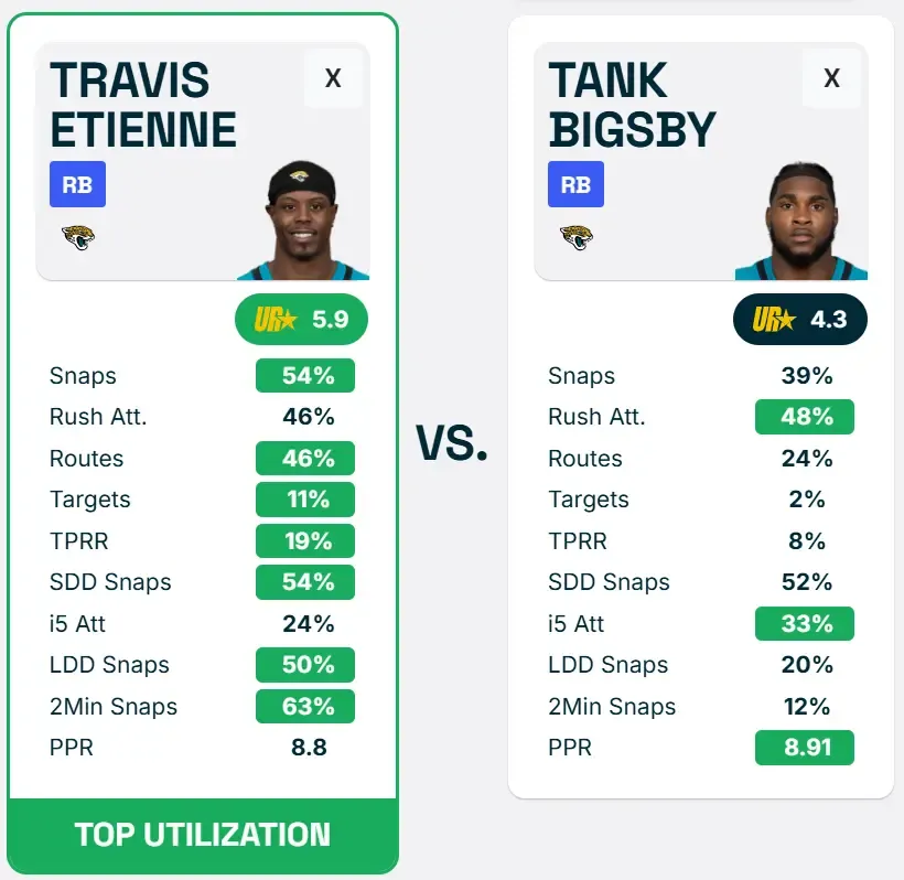 Even though Etienne has played more snaps and has been more involved in every element of the passing game and high-leverage situations like LDD & 2Min Snaps, Bigsby holds an edge in rushing attempts by a mark of 154-137. Bigsby also has six rushing TDs to Etienne's two.