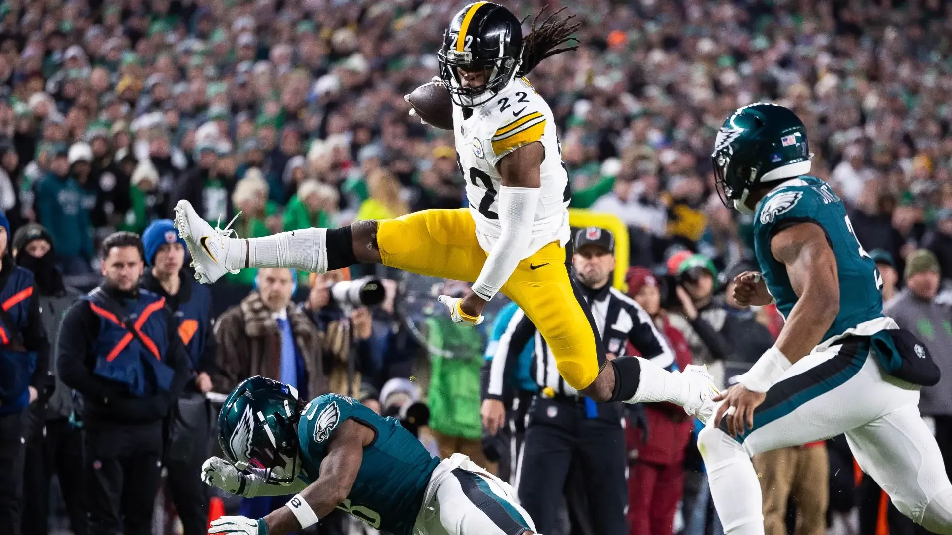 Dec 15, 2024; Philadelphia, Pennsylvania, USA; Pittsburgh Steelers running back Najee Harris (22) leaps over Philadelphia Eagles safety C.J. Gardner-Johnson (8) while running with the ball during the first quarter at Lincoln Financial Field. Mandatory Credit: Bill Streicher-Imagn Images
