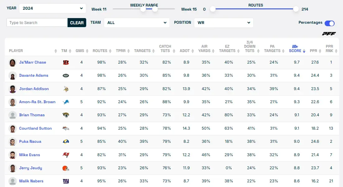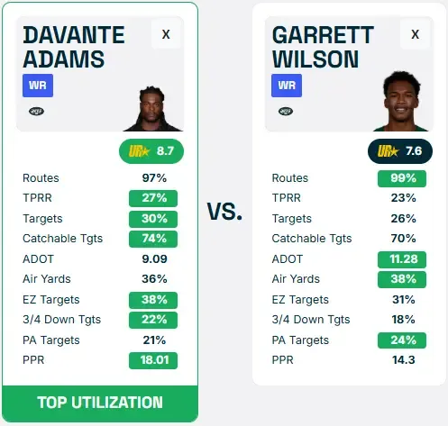 While Wilson has remained strong in his own right, Adams leads the team in most Utilization Categories. Over his last four games, Adams ranks second in Utilization Score (9.4), trailing only Ja'Marr Chase (9.7).