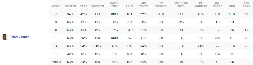 A week after leading the Bills in target share (38%), Cooper failed to register one target, and his route participation plummeted to a five-game low (42%). The trade-deadline acquisition has yet to reach a 70% route participation rate in six games, subduing his Utilization Score to 4.1.