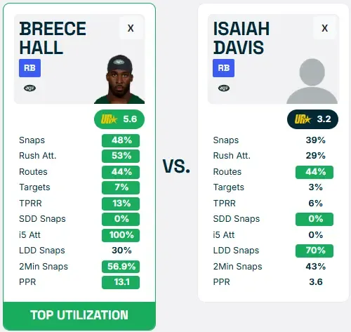Davis is a midrange RB4 if Allen is out and offers contingent RB2 upside should something happen to Hall. Over the final two weeks of the fantasy season, the Jets have favorable matchups against the Rams and Bills.