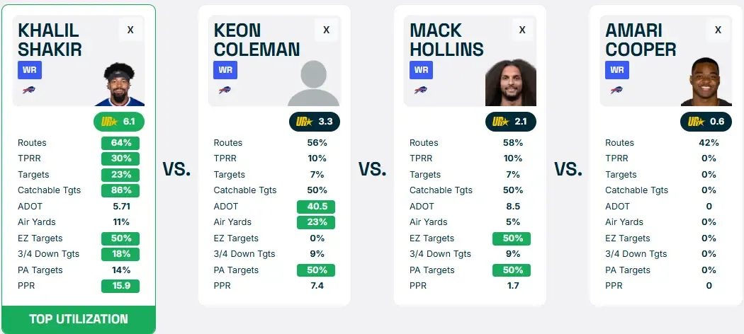 Shakir continued to lead the team in target share (23%) and fantasy points (15.9), but his four-game streak of 80%-plus route participation ended (64%). In healthy games with less than 80% route participation, Shakir has averaged 13.9 points with a 5.3 Utilization Score—far lower than his 6.8 from Week 10 to 14. To create his comp group, I used the middle ground.