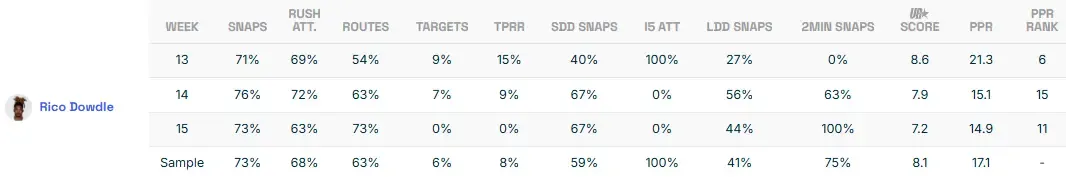 Over the last three games, Dowdle has led the Cowboys backfield in snaps (73%), rushing attempts (68%) and route participation (63%). Over that span, he has an 8.1 Utilization Score with 17.1 points per game.