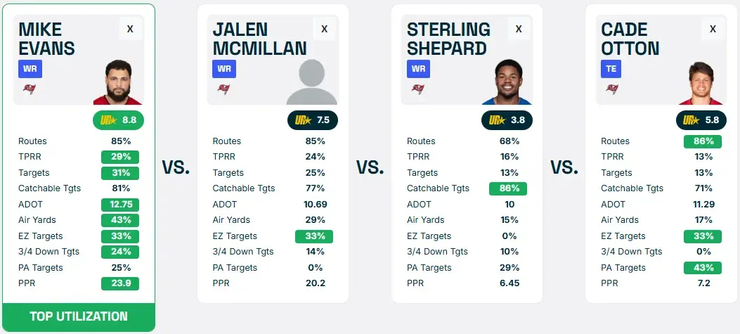 - Mike Evans | Buccaneers (+0.9): Evans has an 8.9 Utilization Score in four games without Chris Godwin, averaging 21.4 points per game. Over that stretch, he leads the team with a 29% target share, 46% air yards share, and 29% endzone target share. Additionally, 32% of his targets have come on play action—worth a 26% point-per-route boost based on the last three years of data. Evans is the top dog on the sixth-best passing offense (258 yards per game). Evans is HOLDING STEADY as a midrange WR1 with high-end WR1 upside.
