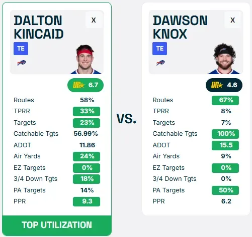 Prior to his injury, Kincaid reached a 21% TPRR or higher in six straight contests. Hopefully, the route participation will ramp up as he gets healthier, but Kincaid has reached 80% only twice this year. The second-year tight end would offer significant upside with more playing time. For now, he provides low-end to midrange TE1 upside based on his comps.