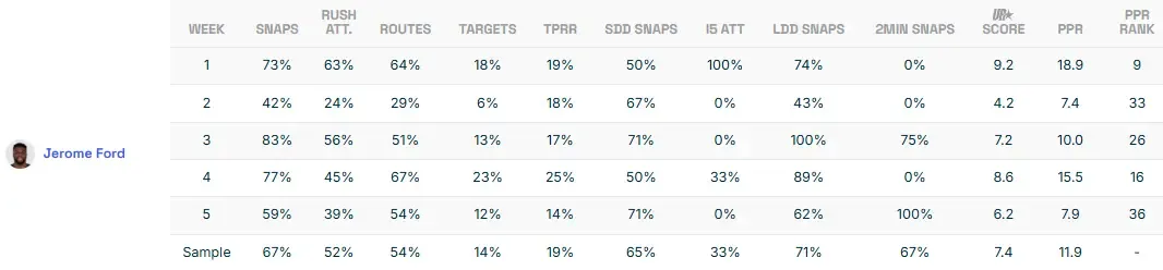 Nick Chubb suffered a broken foot, ending his season and opening the door for Ford to take another swing at the lead role in Cleveland. In Weeks 1 through 5, Ford was the team's top back with a 67% snap share and 52% rush share. Over that span, he posted a 7.4 Utilization Score but averaged only 11.9 points in an anemic pre-Jameis Winston offense.