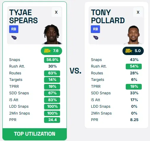- Tony Pollard | Titans (-0.4): Pollard has battled an ankle issue over the last two games, which opened the door for more playing time for Spears. Over that span, he has a 43% snap share and a 5.0 Utilization Score, averaging 8.3 fantasy points. Given how well Spears has performed, we could see more of a hot-hand approach the rest of the way, and game scripts could be a problem—Spears has taken over the long-down-distance (100%) and two-minute (100%) roles. Pollard DOWNGRADES to RB3 territory.