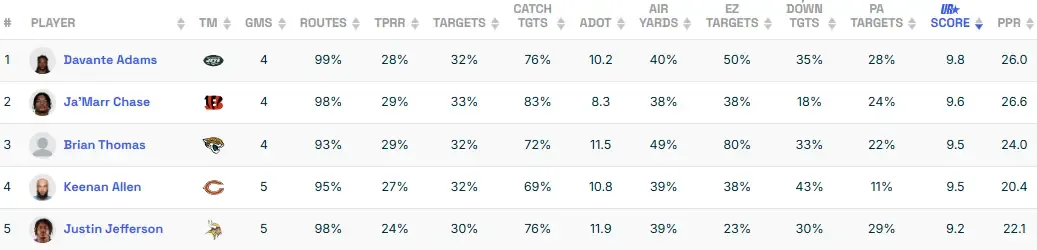 Going back to the Bears bye week, when Allen was finally over his early-season heel injury, he has an 8.1 Utilization Score. Based on the last four years of data, 64% of his comps were WR1s, with the remaining 32% finishing as WR2s.