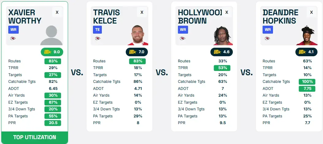 Hollywood Brown was only on the field for 33% of the Chiefs' pass plays but posted a monster 53% targets per route run rate.