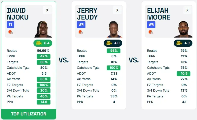 David Njoku was able to scratch out 14.6 points on a 33% target share, but Jerry Jeudy and Elijah Moore were less fortunate with only 4.0 and 4.1.