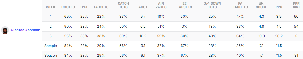 Johnson was doing his part over the first two games with a 23% target share, but Bryce Young was too much to overcome. However, in Johnson's first game with Andy Dalton under center, he exploded for 26.2 fantasy points on a 38% target share.