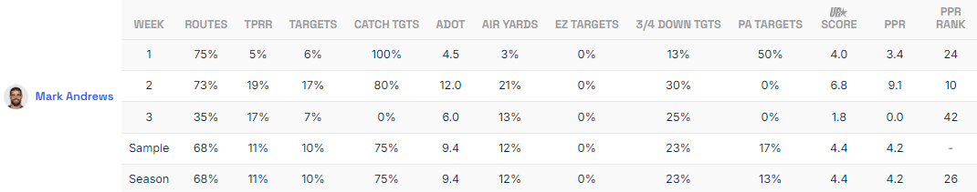 My gut tells me Andrews is too good of a player to completely disappear from the Ravens as a featured player for the entirety of the season. However, he is still returning from tightrope surgery, which could also be a factor, so we must acknowledge the reality of the early season swoon.