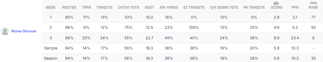 The No. 9 overall NFL Draft pick tied for the team lead in target share (24%) and led the way in air yards (49%) and endzone targets (40%) in Week 3.