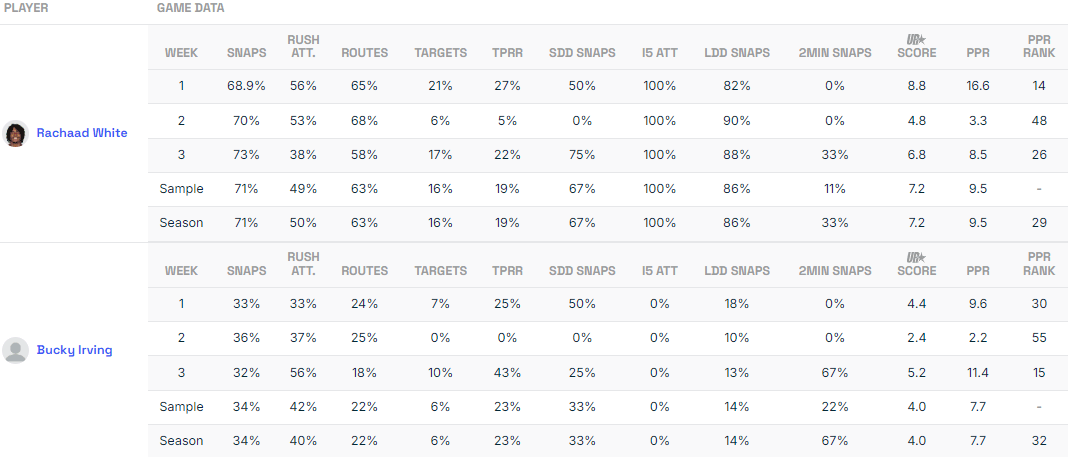Irving has two top-30 fantasy finishes in three games despite never handling more than 36% of the snaps. More importantly, his rush attempt share surged past Rachaad White to 56% in Week 3.