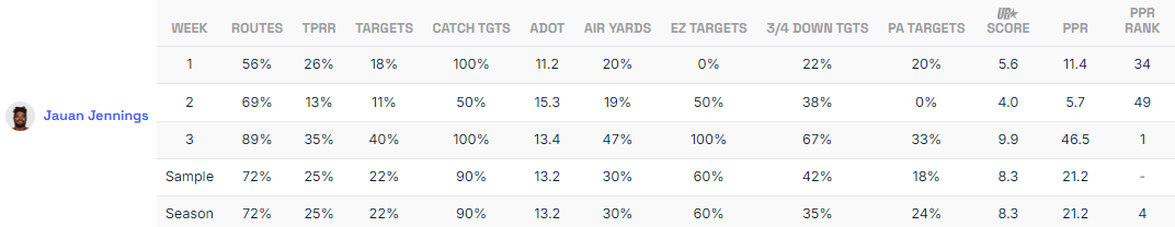 Jennings is available in almost 70% of Yahoo leagues but should not be a high-priority add for your fantasy team. But before we dive into the reasons for that statement, let us admire Jennings's monster 9.9 Utilization Score performance from Week 3.