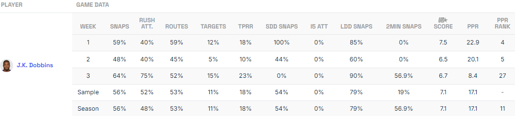 After flying high with 22.9 and 20.1 fantasy points in the first two games, Dobbins tumbled back to earth with 8.4 in Week 3. However, based on the underlying data, Week 3 was his strongest from a utilization perspective, with season-highs in snaps (64%) and rush attempts (75%).