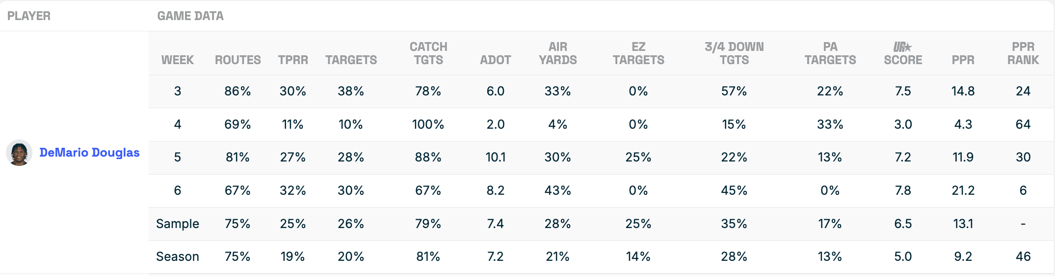 Pop Douglas got off to a slow start, but he owns a 6.5 Utilization Score over the last four games, largely thanks to a 25% target share. During that stretch, he averaged 13.1 points per game, including a season-high 21.2 points in Week 6 with Maye at QB.
