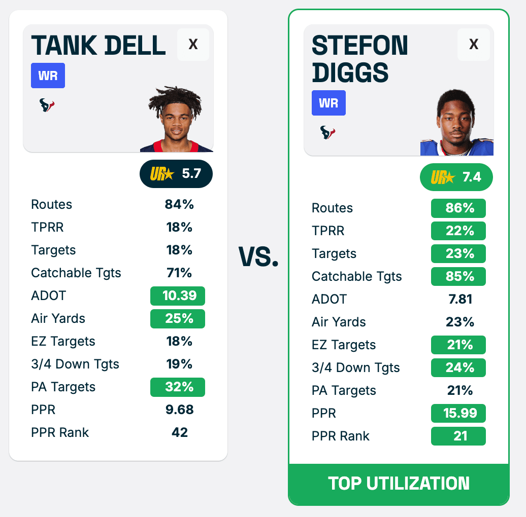 With Collins out due to a hamstring injury that will keep him sidelined for another three games, Dell and Diggs stepped into more prominent roles in Houston. Dell led the team with a 91% route participation and a juicy 31% target share on his way to a season-high 8.3 Utilization Score. The second-year WR ended the day with 18.7 fantasy points.