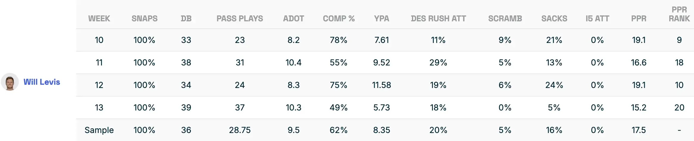 I SAID THIS WEEK WAS GOING TO BE WEIRD, OKAY?! Will Levis has a favorable rest-of-season schedule and with quarterbacks like Jayden Daniels and Lamar Jackson on bye then you might have to dig deep. Earlier this season you did not want to get near Levis in fantasy, but he has scored 15-plus points in four straight games.![]()