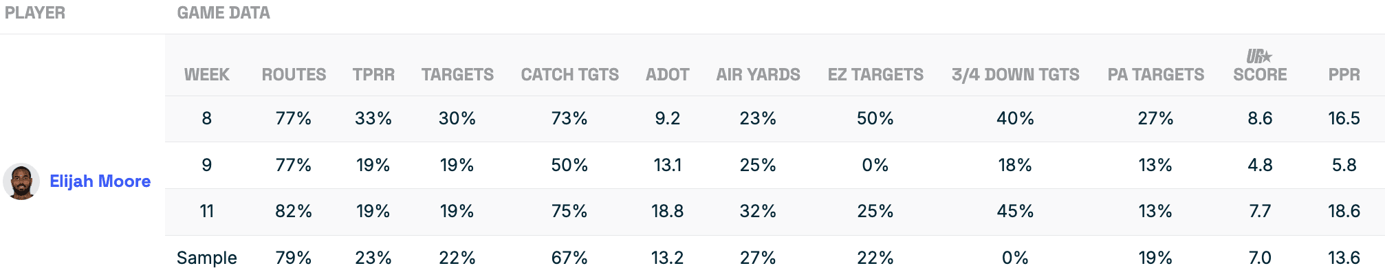 Elijah Moore is getting the waiver wire highlight this week because he has 29 targets over the last three weeks. On Sunday against the Saints he turned six receptions into 66 yards and a touchdown. With Winston, Moore has averaged 13.6 points per game with a 7.0 Utilization Score: