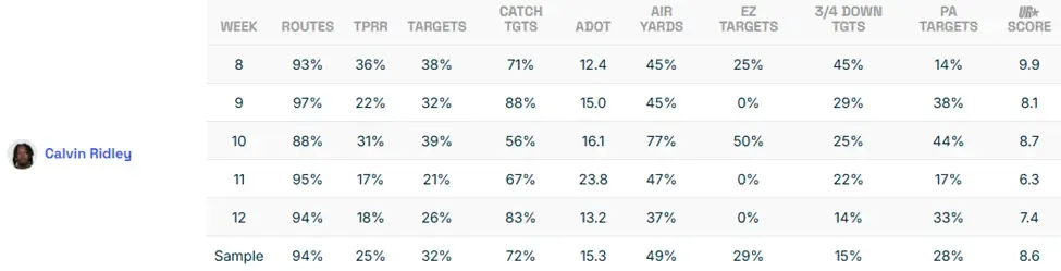 Per our Utilization Report game logs, Ridley’s UR Score of 8.6 since Week 8 puts him in the WR1 conversation. However, two other things stick out. First, he hasn’t seen less than 20.0% of the looks over the five-game sample. Also, his aDOT has fallen. Admittedly, going from 18.4 yards per target to 15.3 doesn’t instill a ton of confidence. For reference, Rashod Bateman has a 15.4-yard aDOT. However, if Levis is targeting Ridley more often and setting up explosives, there’s a direct path to the top 12 in Week 13.
