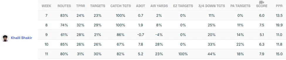 Amari Cooper has been active for three games since his trade to Buffalo. In each of those games, Khalil Shakir has run more routes and earned more targets. Plus, as he’s played 75.8% of his snaps from the slot, Shakir has become Josh Allen’s preferred target in obvious passing situations or if pressured. However, like his slot brethren before him, he draws a tough matchup for Week 13.