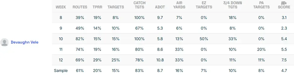 Denver’s backfield rotates RBs on a week-to-week basis. Lil’Jordan Humphrey keeps mixing in for looks. The offense lacks consistency outside of Bo Nix creating with his legs and Sutton Moss’ing defenders. But let me make the case for Devaughn Vele.