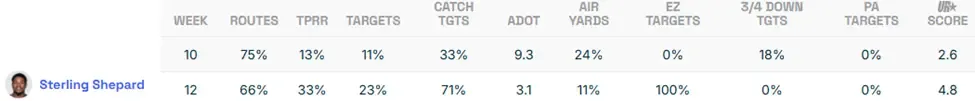 Without Evans (or Chris Godwin) healthy, Mayfield targeted his TEs and RBs on 56.4% of his attempts. In Week 12, their collective share dropped to 40.0%. And as Evans commands more defensive attention, a guy like Sterling Shepard becomes a FLEX option.