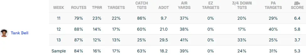 He has oscillated from a WR1 or WR2 role to a WR4 every week since Tua Tagovailoa came back from IR. The simple (i.e., wrong) analysis would be that after a game with a 27.0% target share, he’ll be back down to 10.0% in Week 15 based on the two-month pattern. But the advanced (i.e., better) interpretation of his results would be to look at his teammates.