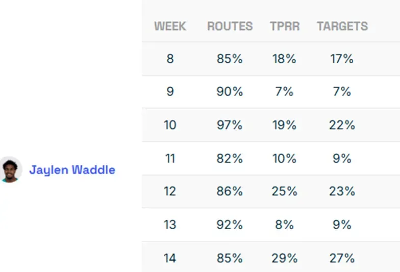 In the case of Jaylen Waddle, sneaky is synonymous with inconsistent. And I don’t just mean his fantasy point totals. Look at his target shares over his last seven games. ![]()