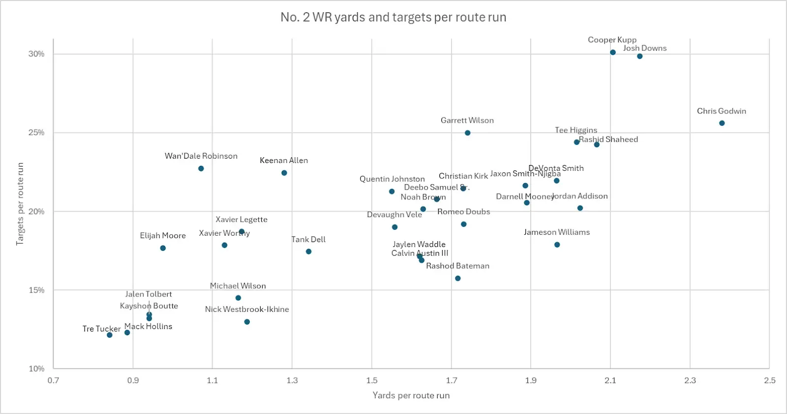 He's up there! However, there are a handful of de facto No. 2 WRs who have been superior this season in terms of yards and targets per route run. Note that the pecking order in some WR rooms is less clear than others, so I generally used targets as a tiebreaker. Feel free to yell at me about the choices regardless.